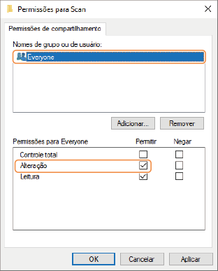 Em [Nomes de grupo ou de usuário], selecione [Everyone] e marque a caixa de seleção [Permitir] em [Alteração].