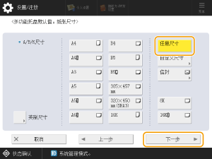 根据型号的不同,可能无法选择<任意尺寸>。在这种情况下,请选择现有纸张尺寸,如<A4>或<LTR>。