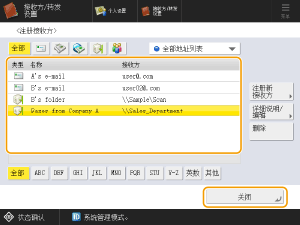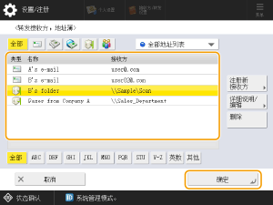 从<个人地址列表>、用户群组地址列表、<地址列表1>至<地址列表10>或<管理员的地址列表>中选择接收方。