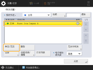 选择“Faxes from Company A”,然后按<有效/无效>并将其设置为<打开>。