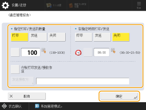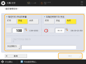 如果将<管理设置>中的<显示作业日志>设置为<关闭>,则无法配置通信管理报告设置。此外,如果将<管理设置>的<显示作业日志>设置从<关闭>更改为<打开>,通信管理报告的<指定打印/发送的数量>和<在指定时间打印/发送>设置会自动设为<关闭>。