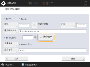 用于管理部门识别码的用户信息和密码必须与注册用于在“用户认证”中进行本地设备认证的信息相符。如果注册的部门识别码或PIN因为机器信息分发等原因发生更改,则还要更改用于本地设备认证的用户信息。