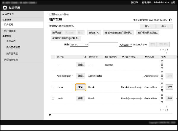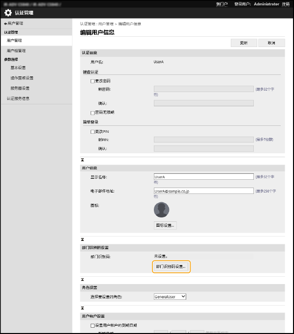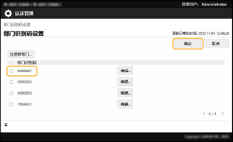 部门识别码的管理仅针对已注册到本地设备(本机)的用户。