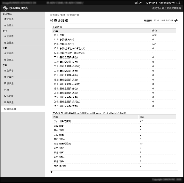 本节介绍如何使用本机的计数器来检查复印、打印或扫描的张数。