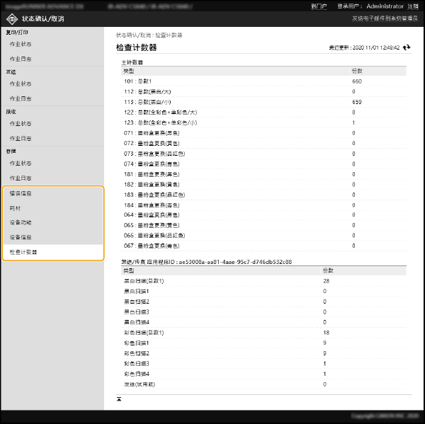 显示复印、打印、传真和扫描的页数。