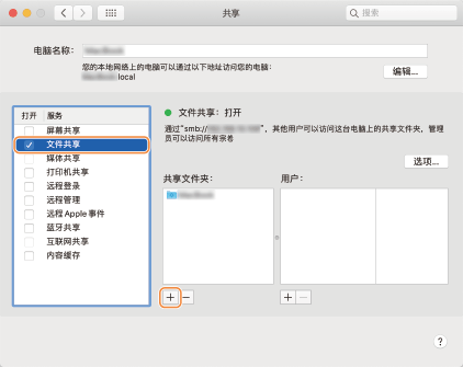 选中[文件共享]复选框,然后单击[共享文件夹]的[+]。