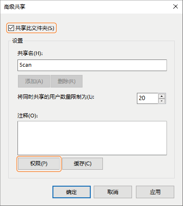 选中[共享此文件夹]复选框,然后单击[权限]。