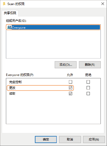 在[组或用户名]中,选择[Everyone],然后选中[更改]的[允许]复选框。