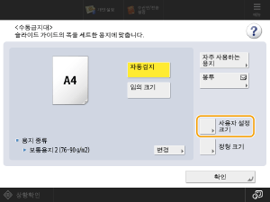 수동 급지대에 용지를 넣으면 용지 크기와 종류를 설정하는 화면이 나타납니다.
