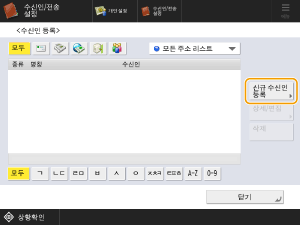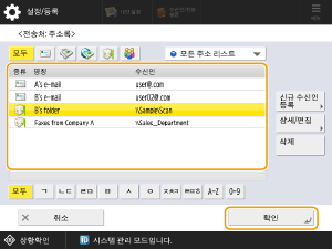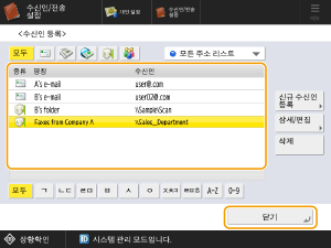 <개인 주소 리스트>, 사용자 그룹 주소 목록, <주소 리스트 1> ~ <주소 리스트 10> 또는 <관리자용 주소 리스트>에서 수신인을 선택합니다.