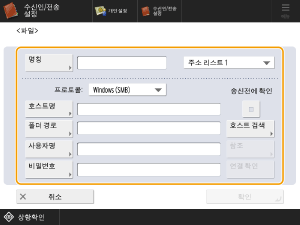 <Windows (SMB)>를 선택하면 <호스트 검색> 및 <참조> 버튼이 나타납니다. 이렇게 하면 네트워크에서 찾아보거나 검색할 때 파일 서버를 쉽게 지정할 수 있습니다.