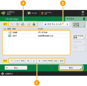 주소록 유형을 선택하는 드롭다운 목록특정 수신인 그룹을 표시하게 해줍니다. 개인 인증 관리 방식으로 기기에 로그인되어 있는 경우, <개인 주소 리스트>를 선택하면 개인 주소록이 표시됩니다.