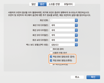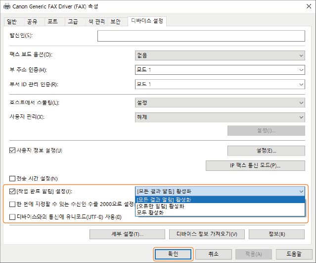 [디바이스 설정] 탭에서 [[작업 완료 알림] 설정]을 선택하고 [확인]을 클릭합니다.