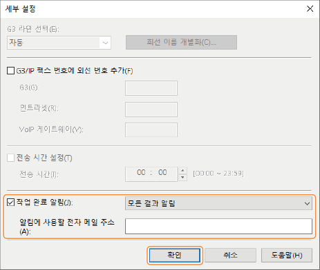 [작업 완료 알림]을 선택하고 [알림에 사용할 전자 메일 주소]에 이메일 주소를 입력한 다음 [확인]을 클릭합니다.