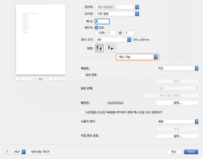 프린트 대화 상자 팝업 메뉴에서 [특수 기능]을 선택합니다.