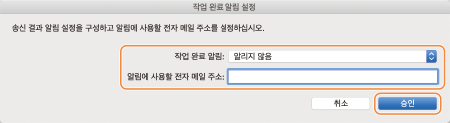 [작업 완료 알림 설정] 대화 상자에서 [작업 완료 알림]을 선택하고 [알림에 사용할 전자 메일 주소]에 이메일 주소를 입력합니다. 그런 다음 [승인]을 클릭합니다.