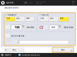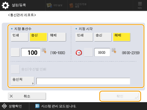 <관리설정>에서 <작업이력 표시>를 <해제>로 설정한 경우, 통신 관리 리포트 설정을 구성할 수 없습니다. 또한 <관리설정>의 <작업이력 표시>를 <해제>에서 <설정>으로 변경하면 통신 관리 리포트에 대한 <지정 통신수> 및 <지정 시각> 설정이 자동으로 <해제>로 설정됩니다.