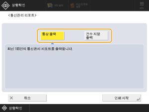 인쇄 기능을 사용할 수 없음을 표시하는 <프린터의 점검이 필요합니다. (담당 서비스로 연락)> 메시지가 나타나면 <건수 지정 출력>에 지정된 수의 항목에 대한 통신 로그가 복구 후 통신 관리 리포트에 인쇄됩니다.