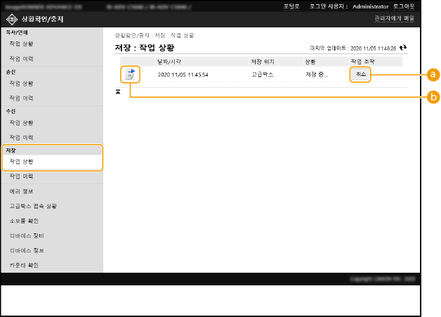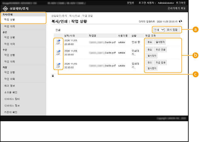 이 단원에서는 리모트 UI를 사용하여 본 기기에서 작업 상태를 확인하고 작업을 취소하거나 재개하는 방법을 설명합니다.