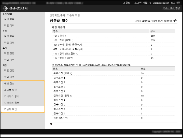 복사, 인쇄, 팩스 전송 및 스캔한 페이지 수를 표시합니다.