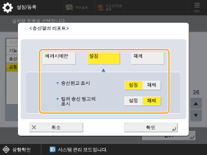 팩스, 이메일 또는 I-팩스를 전송할 때 및 파일 서버나 메일 박스에 데이터를 저장할 때 송신결과 리포트를 자동으로 인쇄하도록 설정을 구성할 수 있습니다. 또한 에러가 발생할 때만 송신결과 리포트가 인쇄되도록 지정할 수 있습니다.