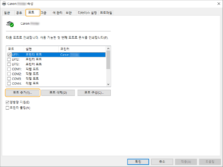 [포트] 탭에서 [포트 추가]를 클릭합니다.