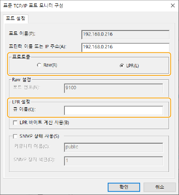 LPR은 일반적으로 TCP/IP를 통해 사용되는 프로토콜입니다. 프린터에서 강제 홀드와 같은 조건으로 LPR 사용을 지정하려면 여기 드라이버에서도 LPR을 지정하십시오.
