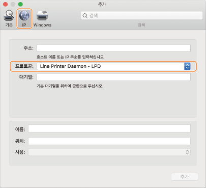 도구 모음에서 [IP]를 클릭하고 [프로토콜]에서 [Line Printer Daemon - LPD]를 선택합니다.