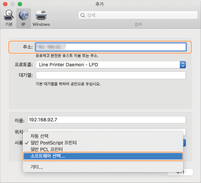 [주소]에 본 기기의 IP 주소를 입력하고 [사용]에서 [소프트웨어 선택]을 선택합니다.