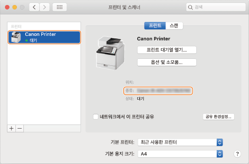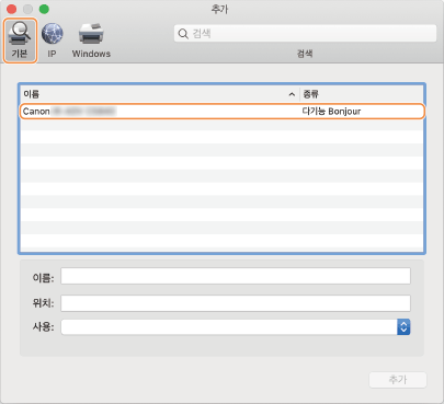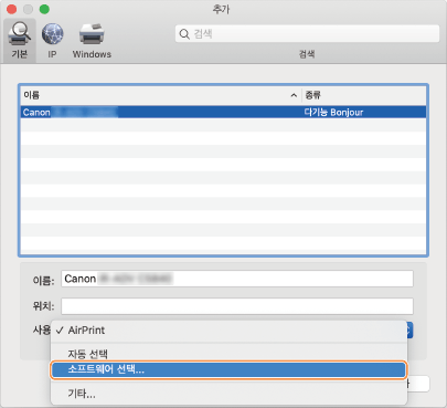 [종류]에 "Bonjour"가 표시된 프린터를 선택합니다.