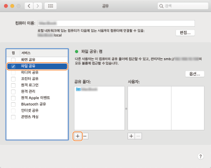 [파일 공유] 확인란을 선택하고 [공유 폴더]의 [+]를 클릭합니다.