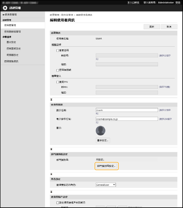 對於註冊的使用者名稱管理部門識別碼。檢查部門識別碼是否已指派給已註冊到本機的使用者。
