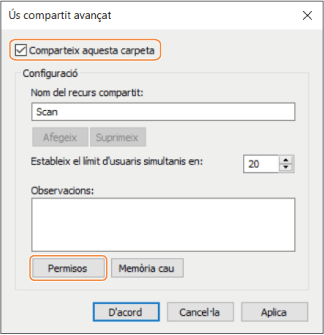 Seleccioneu la casella [Comparteix aquesta carpeta] i feu clic a [Permisos].