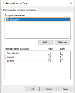 A [Noms de grups o usuaris], seleccioneu [Tothom] i seleccioneu la casella [Permet] a [Canvia].
