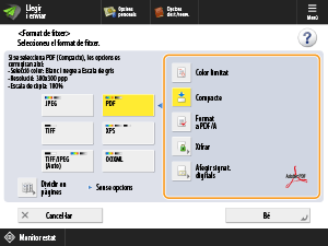 Quan seleccioneu <PDF>, <XPS>, o <OOXML>, també podeu configurar diverses funcions addicionals. Per especificar les opcions, seleccioneu la funció que voleu afegir.