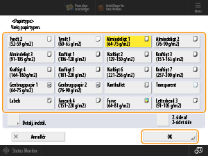 Når du lægger papir i universalbakken, vises skærmen for indstilling af papirformatet og -typen.