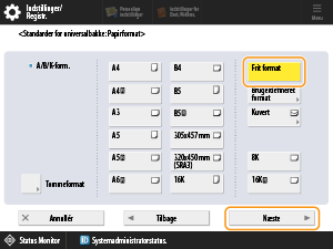 Afhængigt af modellen kan du muligvis ikke vælge <Frit format>. I dette tilfælde skal du vælge et eksisterende papirformat som f.eks. <A4> eller <LTR>.