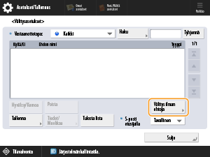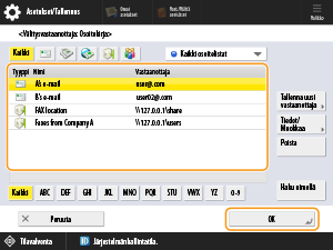 Valitse vastaanottaja kohdasta <Oma osoiteluettelo>, käyttäjäryhmän osoiteluettelosta, kohdasta <Osoitelista 1>–<Osoitelista 10> tai kohdasta <Pääkäyttäjän osoiteluettelo>.