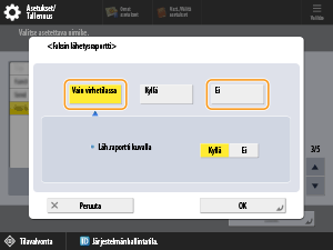 Jos faksin lähetysvirhe tapahtuu tai lähetys perutaan, faksin lähetysraporttia ei tulosteta. Kun tämän asetuksen arvoksi valitaan <Ei>, käytä seuraavaa menettelyä, jotta lähetysraporttia ei tulosteta.