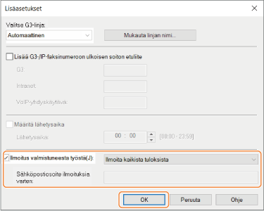 Määritä [Ilmoitus valmistuneesta työstä] -toiminto faksiajurissa ennen faksin lähettämistä.