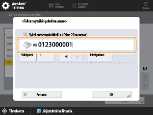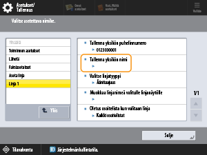Faksilinjan 1 yksikön nimen ja faksinumeron tallentaminen