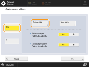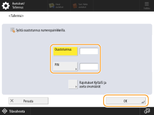 Kirjoita enintään seitsennumeroinen PIN-koodi ja valitse <Vahvista>. Vahvista kirjoittamalla sama PIN-koodi uudelleen ja valitse <OK>. Voit jatkaa PIN-koodia määrittämättä jättämällä kentän tyhjäksi.