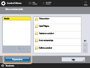 <Omat asetukset> tai <Laiteasetukset> tulevat näkyviin Asetukset/Tallennus-näytössä vain, kun pääkäyttäjä on kirjautunut sisään. Kun valitset jommankumman, ne eivät enää tule näkyviin niin kauan kuin olet kirjautuneena. Jos kirjaudut ulos ja takaisin sisään, vaihtoehdon <Omat asetukset> tai <Laiteasetukset> valintanäyttö tulee uudelleen näkyviin.