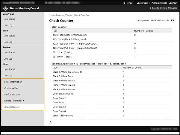 Voit tarkistaa erilaisia tämän laitteen tietoja, kuten virheen tiedot, jäljellä olevan paperin ja väriaineen määrän, asennetut lisävarusteet ja tähän mennessä tulostettujen asiakirjasivujen kokonaismäärän.