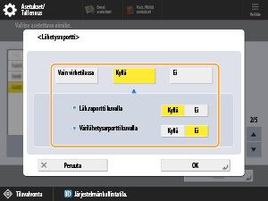 Valitse <Vain virhetilassa> vaiheessa 4. Tämä ottaa käyttöön <Salli tulostus lisäasetuksista> -asetuksen. Määritä <Salli tulostus lisäasetuksista> -asetuksen arvoksi <Kyllä>, kun haluat määrittää <Lisäasetukset>-kohdassa, tulostetaanko <Lähetysraportti> jokaiselle työlle.