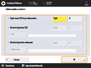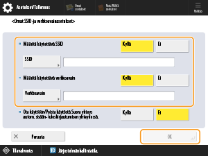 Valitse kohdassa <Määritä käytettävä SSID> asetus <Kyllä> ja kirjoita SSID.