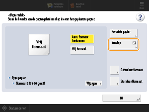 Wanneer u de enveloppen in de papiertafel plaatst, wordt het scherm voor het instellen van het papierformaat weergegeven. Stel het papierformaat als volgt in.