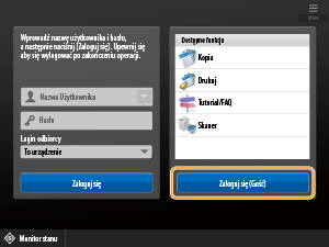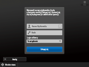 Jeśli pojawi się ekran logowania, zarejestrowani i autoryzowani użytkownicy muszą się zalogować, aby kontynuować eksploatację urządzenia. Wyświetlona zawartość na ekranie logowania różni się w zależności od ustawień zarządzania użytkownikami i użytkownicy powinni kierować się elementami wyświetlonymi na ekranie.