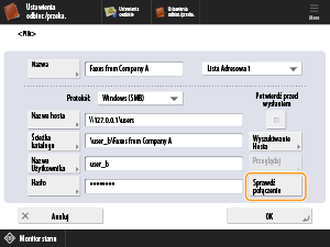 Jeśli ustawisz <Protokół> na <Windows (SMB)> i następnie podasz nieistniejący folder w <Ścieżka katalogu>, folder zostanie automatycznie utworzony, a plik zapisany w utworzonym folderze. Jeśli jednak podano nieistniejące foldery na kilu poziomach, wystąpi błąd wysyłania.