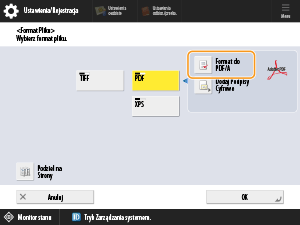 Naciśnij <PDF>, wybierz opcje właściwe dla zastosowania pliku, a następnie naciśnij <OK>